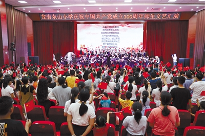 6月30日,由新罗区委文明办、新罗区文化馆、龙岩东山小学共同举办的“红色印记 时代征程”庆祝中国共产党成立100周年师生文艺汇演在东山小学举行。通过合唱、经典诵读、情景小品、民乐合奏、课本剧、舞蹈等多种形式,表达了广大师生爱党爱国之情。图为管乐合奏中,大家挥舞国旗高唱《歌唱祖国》。 记者 曾志明 通讯员 陈钊安 摄