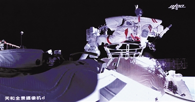 7月4日,在北京航天飞行控制中心大屏拍摄的航天员在舱外工作场面。 新华社记者 金立旺 摄