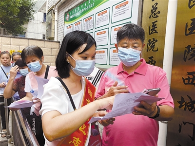 为守护居民健康,筑牢免疫屏障,连日来,新罗区西城街道西兴社区动员辖区60周岁以上的居民进行新冠肺炎疫苗接种,并组织志愿者前往接种点引导、帮助老年群众排队、登记,以确保疫苗接种工作安全有序地进行。图为20日志愿者在接种点指导老年居民申请新冠肺炎疫苗预约登记码。 记者 蓝芳 通讯员 陈元杰 摄