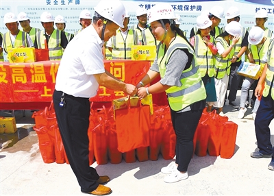 日前,上杭县总工会开展重点工程建设高温慰问活动,前往龙龙铁路中铁十局项目部为员工赠送一批凉茶、防暑包(绿豆、白糖、蜂蜜、防暑药品),给繁忙闷热的工地带来了缕缕清凉,感谢铁路人冒着高温、酷暑依旧坚守在一线作业。图为慰问场面。 记者 傅长盛 通讯员 李小勇 摄