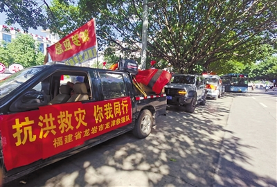 23日下午,龙岩市龙津救援队9名救援人员和4辆满载各种物资的救援车驰援河南新乡。图为整装待发的车队。记者 杨燕 通讯员 江雅萍 摄