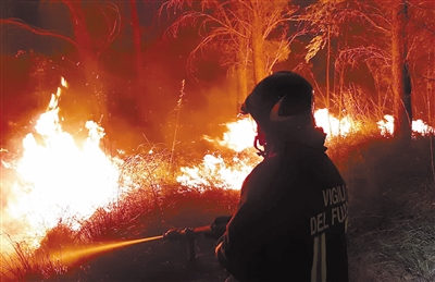 7月26日,消防员在意大利撒丁岛参与灭火作业。近日,野火肆虐意大利撒丁岛。蔓延的野火已导致至少1500名当地居民被迫撤离,约两万公顷土地被烧毁,数座农场、房屋被烧毁。当地已宣布进入紧急状态。