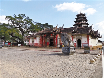 在广袤的田野上,天后宫由前低后高的三进式建筑组成,第一、第二进是平房,第三进则是七层宝塔。远远看云,天后宫就像扯满帆的航船,驶向大海。