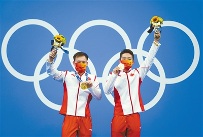 7月28日,中国选手谢思埸(左)/王宗源在颁奖仪式上。当日,在东京奥运会男子双人三米跳板决赛中,中国选手谢思埸/王宗源获得冠军。 新华社记者 许畅 摄