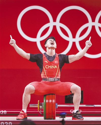 7月28日,中国选手石智勇(广西籍、浙江运动员)在比赛中。当日,在东京奥运会举重男子73公斤级决赛中,中国选手石智勇夺冠。新华社记者 杨磊 摄