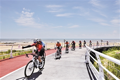 在阳光海岸绿道上,随处可见骑行的游客和市民,这里是人们健身休闲的乐园。他们头顶蓝天,耳听涛声,自由畅行,尽情舒展着青春的活力。