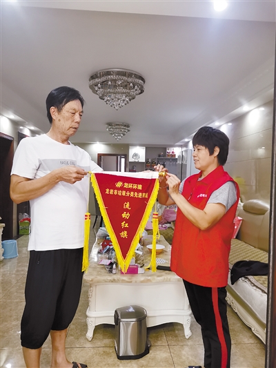 自2020年3月开始,福建省龙环环境有限公司新罗分公司实行流动红旗奖励机制,每个月对小区践行垃圾分类较好的先进家庭授流动红旗,并赠送小礼品。截至目前,已有130余户家庭得到过流动红旗。图为7月21日,向南城街道莲滨社区厦鑫博世园二期的垃圾分类管理员颁发流动红旗。 记者 刘玉荣 通讯员 张加安 摄