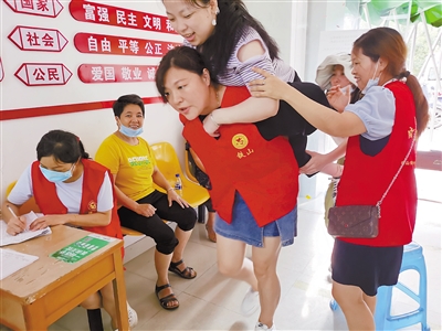 “你上来,我背你!”一位社区干部见状没有丝毫犹豫,一边说,一边弯下腰,在其他工作人员帮助下,将残疾女子背到二楼的“专座”,并全程帮助她完成了疫苗接种,获得了在场群众及其家属的好评。