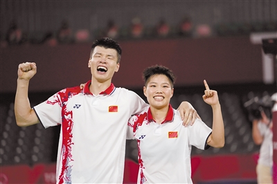 7月30日,王懿律/黄东萍(右)庆祝夺冠。当日,在东京奥运会羽毛球混合双打决赛中,中国选手王懿律/黄东萍战胜另一对中国选手郑思维/黄雅琼,获得冠军。