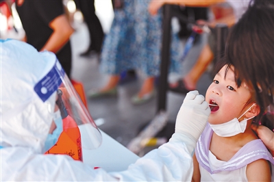 7月31日,在长沙市天心区赤岭路街道白沙花园社区核酸检测点,一名小朋友在接受核酸检测取样。长沙市新型冠状病毒肺炎防控指挥部办公室通报,自7月31日起,将湖南省长沙市天心区赤岭路街道乾城嘉园、宁乡市城郊街道馨宁新村小区、宁乡市城郊街道未来方舟小区2号栋的风险等级调整为中风险地区。据了解,目前长沙的各中风险地区均在有序开展全员核酸检测工作。