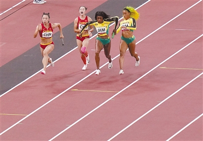 8月6日,中国队队员葛曼棋、梁小静在比赛中。当日,东京奥运会田径女子4x100米接力决赛在新国立竞技场举行,中国队42秒71获得第六名,创历史最佳名次。