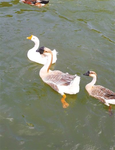 浏金湖里还放养着几只鸭和鹅,为浏金湖增添几许意境。几位小朋友拿着馒头、面包分小块扔到湖里喂鱼,草鱼飞快蹿起一口吞服,立即沉没水中,原本在远处戏水的鹅鸭们迅速游近,等候分食,水中“红掌”拨动间,绿水卷起小波,有的还“鹅、鹅、鹅”地轻鸣,这就是“红掌拨清波”的意境吗?