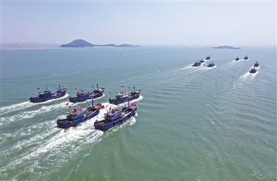 8月16日,在福建省泉州湾海域,渔船驶向大海(无人机照片)。当日,北纬26度30分以南的福建省海域结束为期三个半月的伏季休渔期,渔民开始出海作业。 新华社发 张九强 摄