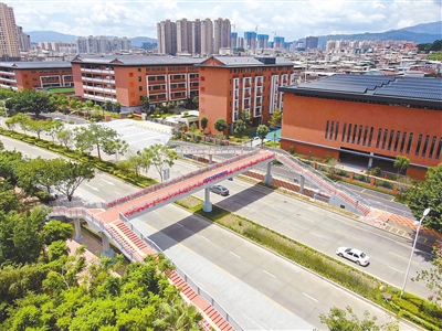 近年来,龙岩中心城区人行天桥如雨后春笋般“冒”出,尤其是规划建设的中小学旁的人行天桥,为学校师生和家长提供了安全保障和便利服务。图为昨日记者航拍的龙岩中心城区今年以来建成的又一座人行天桥——天马小学人行天桥。