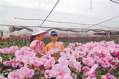 上杭县步云乡凭借良好的高山生态环境和昼夜温差大的气候优势,发展催延花期或花期控制的催花产业,通过“公司+农户”等农业合作方式,建立了300多亩蝴蝶兰催花基地,每年为漳州、厦门和广东汕头等地客商提供催花200多万盆,销往省内外以及越南、韩国等,年产值近3000万元。图为昨日,步云梨岭村催花基地花农正在打理即将上市销售的蝴蝶兰。 通讯员 林斯乾 摄