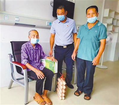 镇里为接种疫苗的黄三嫂送来鸡蛋、牛奶等慰问品。