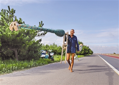 渔民扛着捕捞工具来到海边。