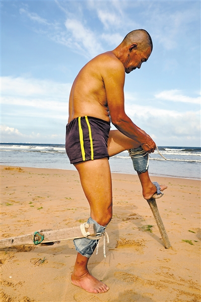 渔民郭建海告诉记者:“在踩高跷的时候,一定得先把腿和高跷绑结实了。在水深时,还可再接上另一副高跷以增加高度。”