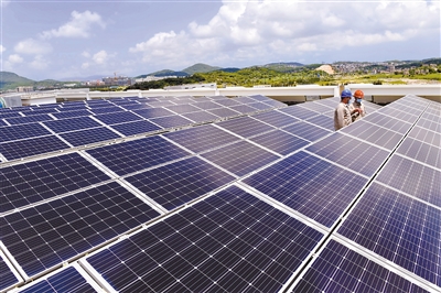 这是8月27日在福建平潭综合实验区岚台物流园拍摄的屋顶分布式光伏发电设施。近年来,福建省围绕“节能降碳,绿色发展”的理念,在电力、交通、城建等方面大力推进以新能源为主体的新型电力系统建设和垃圾分类循环利用,推广低碳绿色建筑,倡导市民绿色出行。