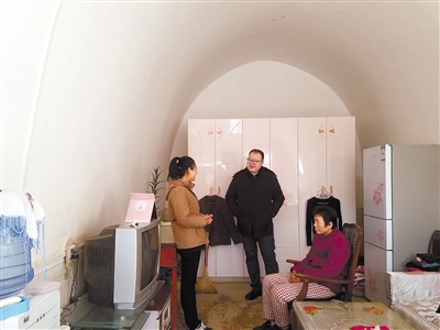邱军(中)在城壕镇余家砭村村民燕刚家中看望其母亲与妹妹(2018年12月11日摄)。 新华社 发