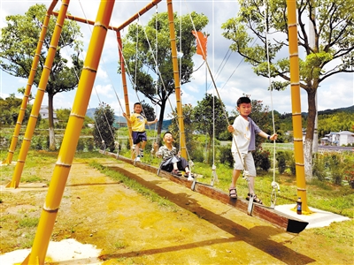 建成水上单车、秋千等网红打卡点和青少年研学农事体验基地,教育研学产业日渐红火。图为孩子们正在高兴地荡秋千。