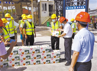 近日,永定区住建局干部前往永定纺织产业园供水厂、市政配套工程一期等项目现场,对高温烈日下坚守工作岗位的建筑工人进行慰问,向工人们发放菊花茶、冬瓜茶等消暑饮品。共慰问100名工人,发放100份消暑饮品。图为发放消暑饮品的场面。 通讯员 林忠成 苏林峰 摄