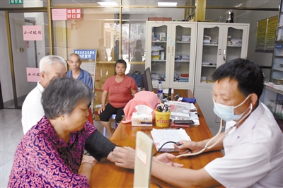 近日,永定区抚市镇五湖村卫生所卫生员正在为村民义务量血压、测血糖。据悉,该村筹集资金26万元,新建一所占地300平方米、功能完备、设施齐全的卫生所,实现群众小病不出村、大病能早防的目标。同时利用综合功能大厅,定期为村民开设健康知识讲座。 记者 罗玉文 通讯员 赖守铭 陈月莲 摄