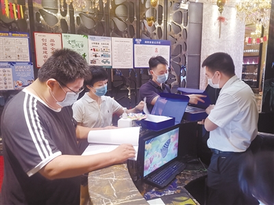 为进一步深入推进“静夜守护”城市夜间噪声污染整治专项行动,全市文化市场综合执法队伍于近日深夜,出动10个检查组共43名执法人员,对市区、县城的49家歌舞娱乐场所进行专项行动检查,处理文化市场投诉举报9件,立案查处2件,责令整改3家次。图为检查现场。 记者 郑秋生 通讯员 钟晖 摄