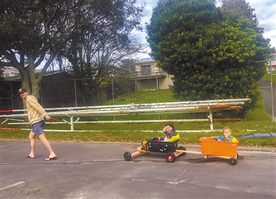 9月17日,在新西兰奥克兰,两个孩子坐在爸爸自制的简易拉车“车厢”里在街上兜风(手机拍摄)。“车厢”是家里的置物筐,框架是简易的木条,六个大小不一的轮子是从不同推车上拆下拼凑的。即便如此,大人孩子均自得其乐。