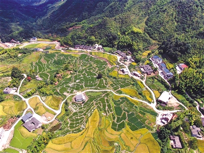 长汀县童坊镇肖岭村海拔近千米,有梯田面积700多亩,每到金秋时节,梯田一片金色,与散落的农家,构成一幅美丽的画卷。今年该村除了继续种植中稻,还流转土地70亩,引进种植大户发展生姜种植,到目前丰收在望,有望获得生姜产值每亩6000多元,绿色生姜田块与黄色中稻梯田构成一幅黄绿交错的美丽画面。图为日前肖岭村梯田鸟瞰。记者 傅长盛 摄