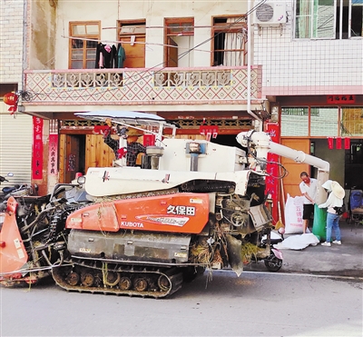 金秋时节,连城县姑田镇广大农户种植的中稻进入黄熟秋收季。农机手们驾驶收割机,进入田间开展有偿服务,每编织袋稻谷收费12元。有的农机手,对农户稻田在村庄附近的,家中缺少劳动力搬运稻谷的,就直接将收获的稻谷运回农户家门口自卸装袋,便民服务受到了广大农户的欢迎。图为近日,一农机手在下堡村农户家门口卸谷装袋。 通讯员 周宗胜 摄