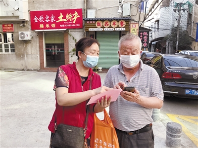 近日,新罗西城苏溪社区广泛组织动员,在辖区有序开展核酸检测信息预登记工作,确保家喻户晓,人人参与、人人登记。图为新时代文明实践志愿者帮助老年人登记信息。 记者 谢津津 通讯员 黄秋萍 摄
