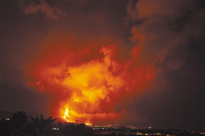 这是九月二十四日在西班牙拉帕尔马岛拍摄的老昆布雷火山喷发的景象。目前,已有超过四百座房屋被火山流出的岩浆摧毁。新华社记者 孟鼎博 摄