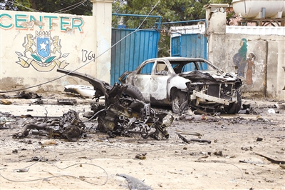 这是9月25日在索马里摩加迪沙拍摄的自杀式汽车炸弹袭击现场。索马里警方25日说,位于首都摩加迪沙的总统官邸附近当天发生一起自杀式汽车炸弹袭击,已造成7人死亡、9人受伤。 新华社 发