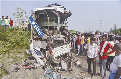 这是10月7日在印度北方邦巴拉班基地区拍摄的交通事故现场。印度警方7日说,印度北部当天发生一起重大交通事故,一辆来自首都新德里的客车在北方邦巴拉班基地区与一辆迎面驶来的卡车相撞,造成至少10人死亡、25人受伤。