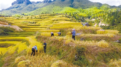 长汀县童坊镇肖岭海拔近千米的高山上有梯田700多亩。金秋时节,金黄色的稻谷层层叠叠,颇具特色。图为10月7日,长汀县祥丰农机专业合作社组织劳力在肖岭梯田收割中稻,青山、梯田、稻谷、农人构成一幅美丽的画卷。 通讯员 陈天长 丘嘉瑞 摄