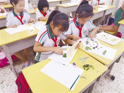 图为压花技巧社团的孩子们正在利用一片片树叶制作精美作品。