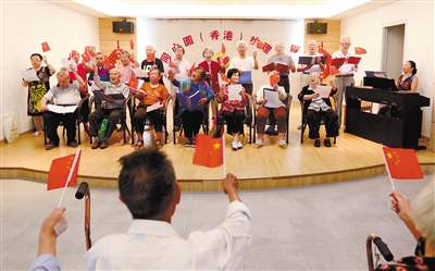 13日,同心圆(香港)护理院老年合唱队演唱《我和我的祖国》。 记者 郭亦斌 曾志明 摄