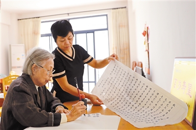13日,上杭县临江镇天山社区百岁老人丘丽贞(左)在练习书法。随着经济社会发展、生活保障水平提高和生态环境质量的不断改善,上杭县百岁老人数量越来越多。据统计,2014—2016年,该县年均12人成为百岁老人, 2017起,年均21人成为百岁老人,总体呈逐年增长趋势。目前,该县共有百岁老人65位。