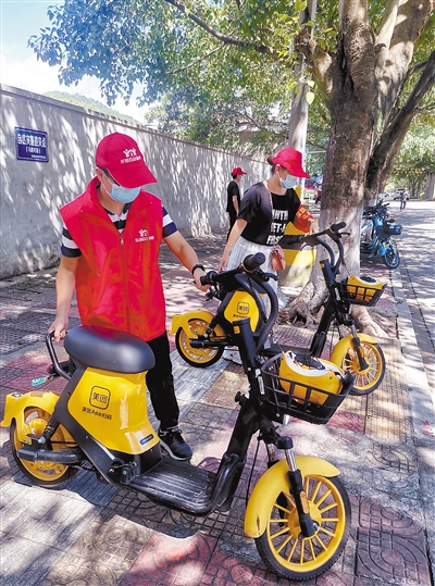 防疫创城两手抓,近日,新罗区东城街道组织街居干部、创城共建单位志愿者深入辖区一线做好疫情防控和环境卫生整治、创城知识宣传等创城整治提升工作。图为志愿者在规范共享单车停放秩序。 记者 刘玉荣 通讯员 苏展 摄