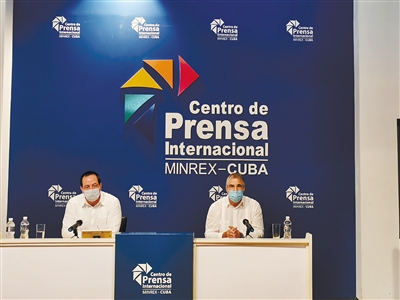 10月12日,在古巴哈瓦那,古巴公共卫生部长波塔尔·米兰达(左)参加新闻发布会。