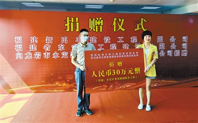 近日,永定区东升鸿公司、新禹丰公司各捐30万元用于龙凤廊桥项目建设。龙凤廊桥项目位于凤城街道,属在建民生工程。图为捐赠现场。
