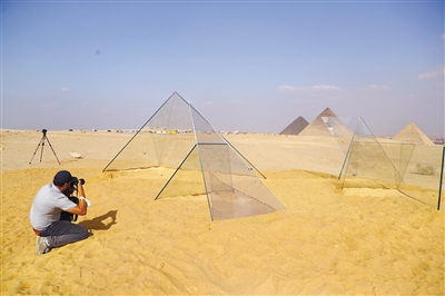 游客在埃及吉萨金字塔景区举办的艺术展上拍摄艺术作品