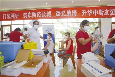 10月23日,在斯里兰卡科伦坡港口城疫苗接种点,当地医务人员给在斯中国公民接种疫苗。“春苗行动”加强针接种近日在斯里兰卡展开。截至10月25日,3266名在斯中国公民(含港澳台地区居民)在科伦坡、汉班托塔等5个接种点免费接种了中国产新冠疫苗第三剂加强针。