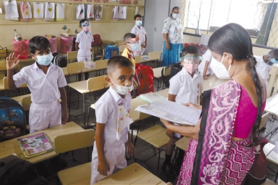 10月25日,学生佩戴口罩和防护面罩在斯里兰卡科伦坡的小学上课。受新冠疫情影响关闭数月后,斯里兰卡所有小学目前均已开学复课。