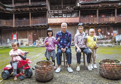 为留守土楼老人和孩子合影,定格家的样貌。