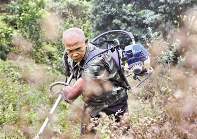 10月29日,细雨霏霏,山雾朦胧,在长汀县三洲镇戴坊村的红旗岭上,“断臂铁人” 兰林金正身背除草机清除茶园杂草。今年59岁的退伍军人兰林金,双手伤残,一只眼睛失明,系一级伤残者。从2010年起,他以顽强的毅力、愚公移山的精神,克服了常人无法想象的各种困难,用残缺的双臂挖了8万多个树坑,种下850亩油茶、400亩毛竹、130亩脐橙、70亩中草药、30亩晚秋黄梨等。如今,种植7年多的油茶进入盛产期,仅油茶果就可采收1万多斤。站在红旗岭上举目四望,昔日一片光秃秃的“火焰山”,在兰林金的辛勤努力下,变成满目青翠、生机盎然的“金银山”。