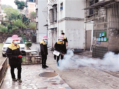 为营造干净、健康、卫生的生活环境,近日,新罗区曹溪街道天马社区开展“除四害”消杀工作。图为工作人员在辖区各小区的下水道、绿化带等公共场所进行投放、喷洒药物。