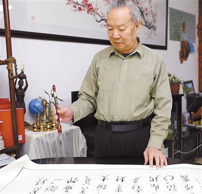 长汀县退休教师黄宏江,1999年退休后移情书画,陶冶情操,丰富生活,潜心研习甲骨文书法,书法苍劲古拙,独树一帜,年过耄耋,依然笔耕不辍,作品在全国性书法比赛中先后获奖130余次,部分作品在东南亚、日韩、欧洲展出,探索出一条甲骨文书法的路子,成为长汀书画界的常青树。图为日前黄宏江老师在家里创作。记者 傅长盛 通讯员 黄启元 摄