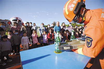 11月9日,市消防救援支队在培训基地举办“119”消防宣传月活动暨首届行业系统消防技能比武竞赛活动。活动现场设置消防器材展示区、消防常识宣传区、灭火体验区等主题展区,通过现场实验、互动体验等方式,让市民群众身临其境地接受消防安全教育。图为救援技能展示。